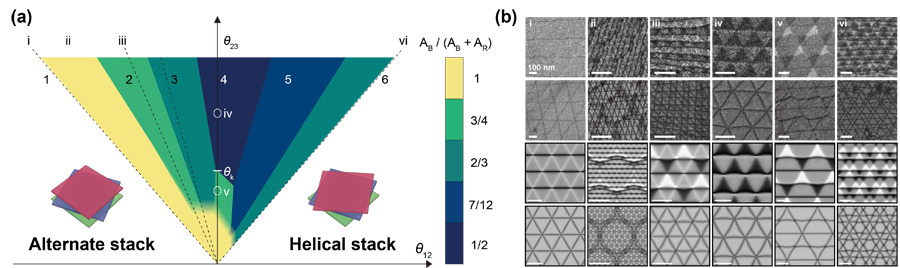 As a result of these intricate interlayer interactions, the resulting hierarchical lattice patterns and distinctive physical properties manifest exclusively in trilayer and thicker multilayer systems. To elucidate these structures, the team combined transmission electron microscopy measurements with computational simulations and report a “structural phase diagram” that maps how various domain lattices emerge as a function of twist angle(see Figs. 2a and 2b). This phase diagram is expected to serve as a valuable guide for future design of quantum materials using multi-moiré lattices.