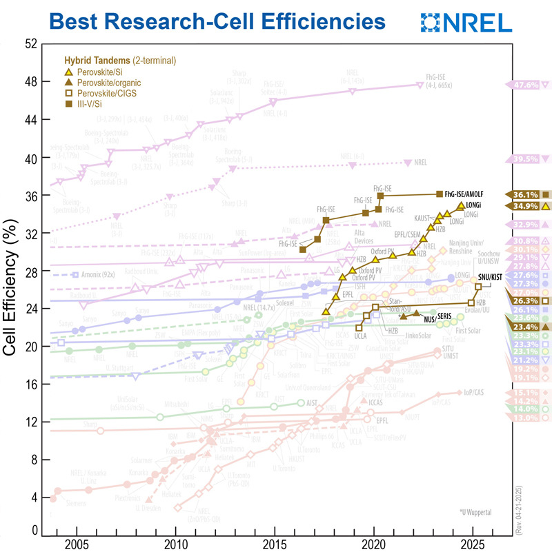 This chart, maintained by the U.S. National Renewable Energy Laboratory (NREL) in Golden, Colorado, shows the world record efficiencies for different types of solar cells. The efficiency of 26.3% achieved by Seoul National University and KIST for perovskite/CIGS tandem solar cells was added in June 2025.